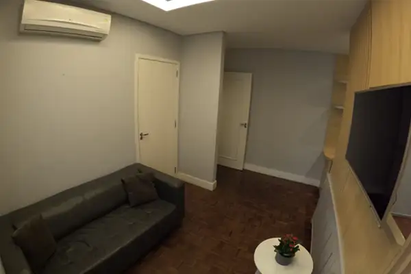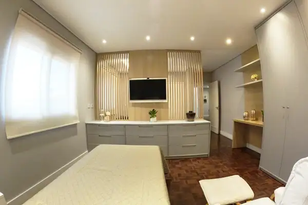 Mais espaço, armários amplos e ante sala com sofá.